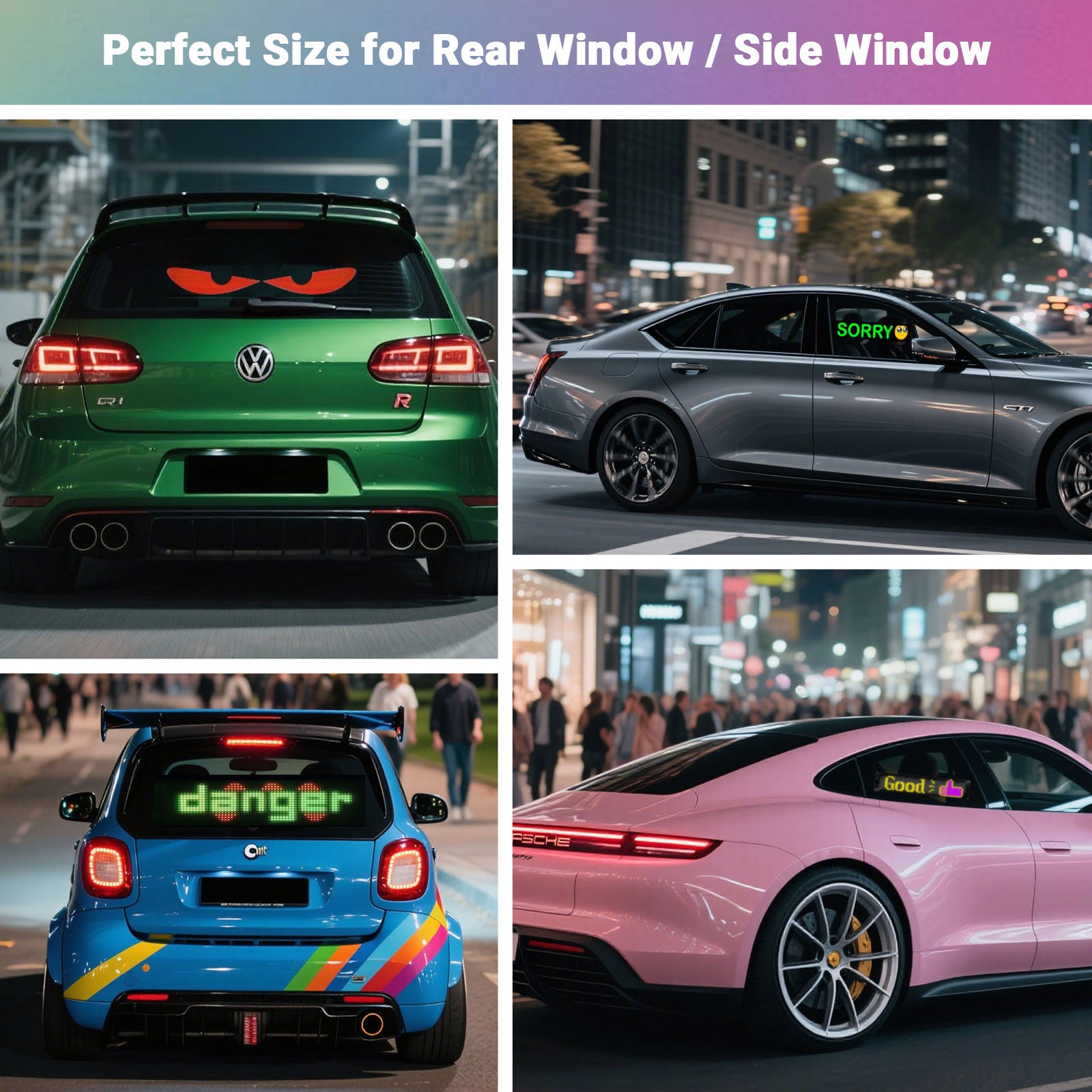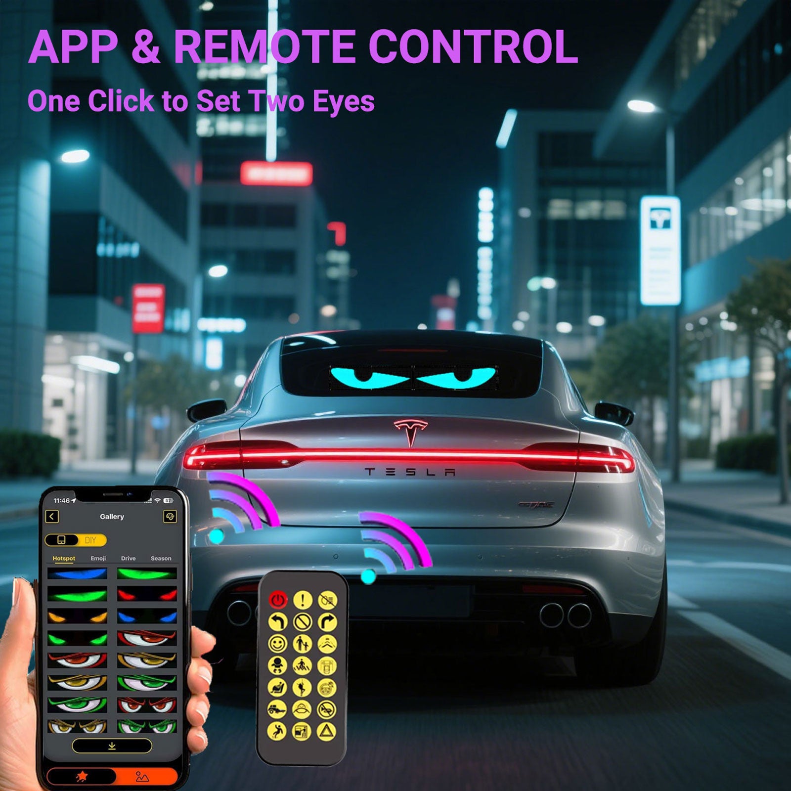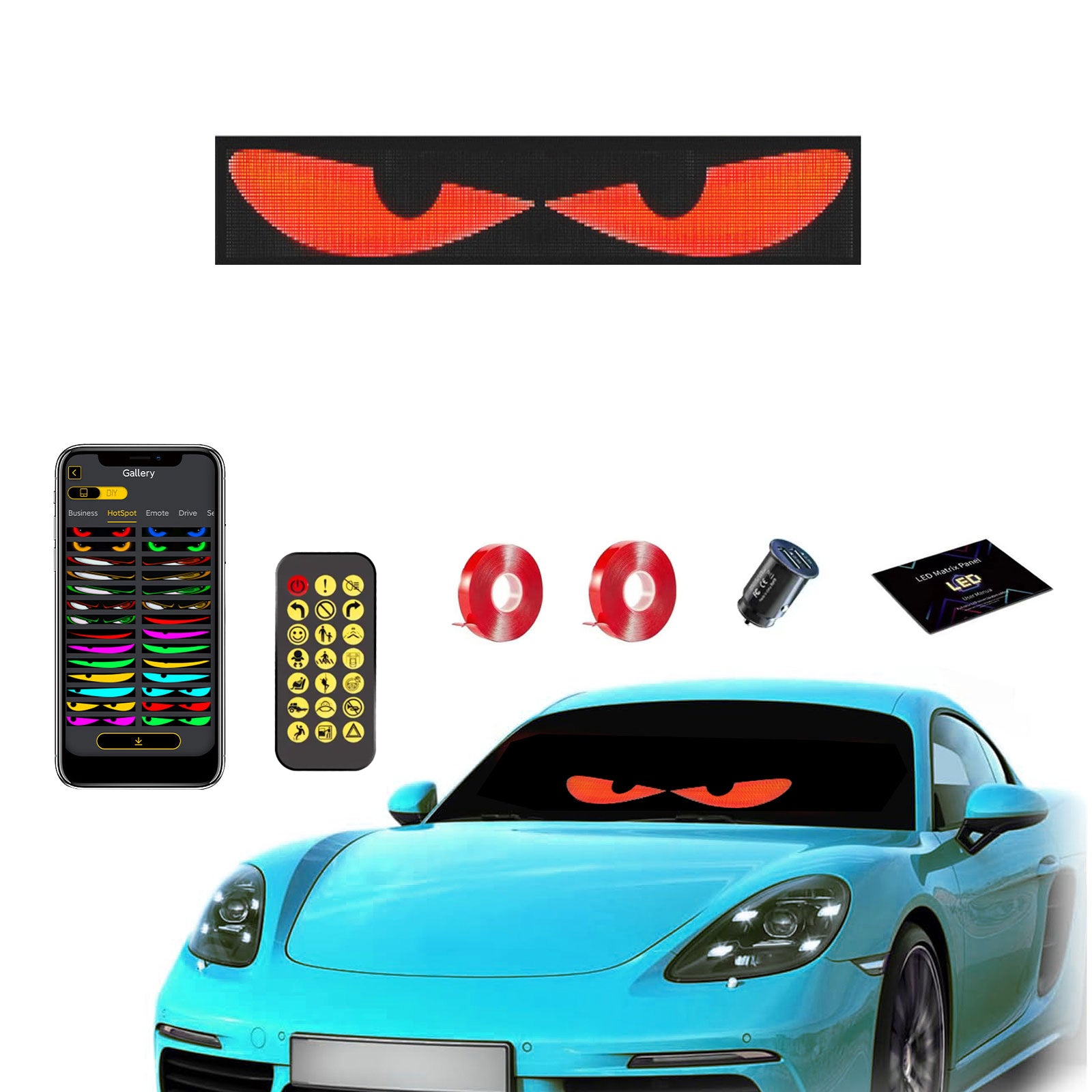 Unlimited Customization: Unleash your creativity with our mobile app, compatible with iOS and Android! Connect via Bluetooth and explore endless customization options—edit scrolling text, create your own designs, or upload personalized images and GIFs. Turn your car into a dazzling DIY light show that showcases your unique style with our truck eyes lights windshield!