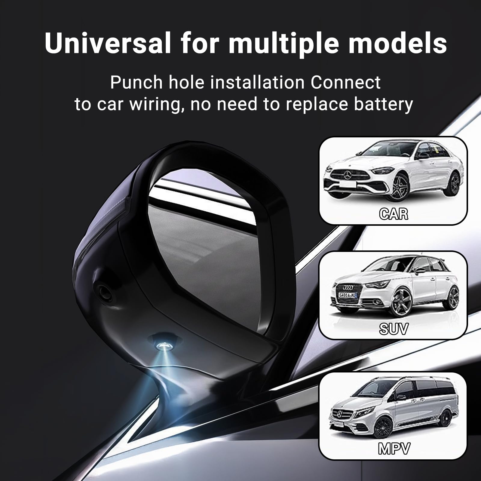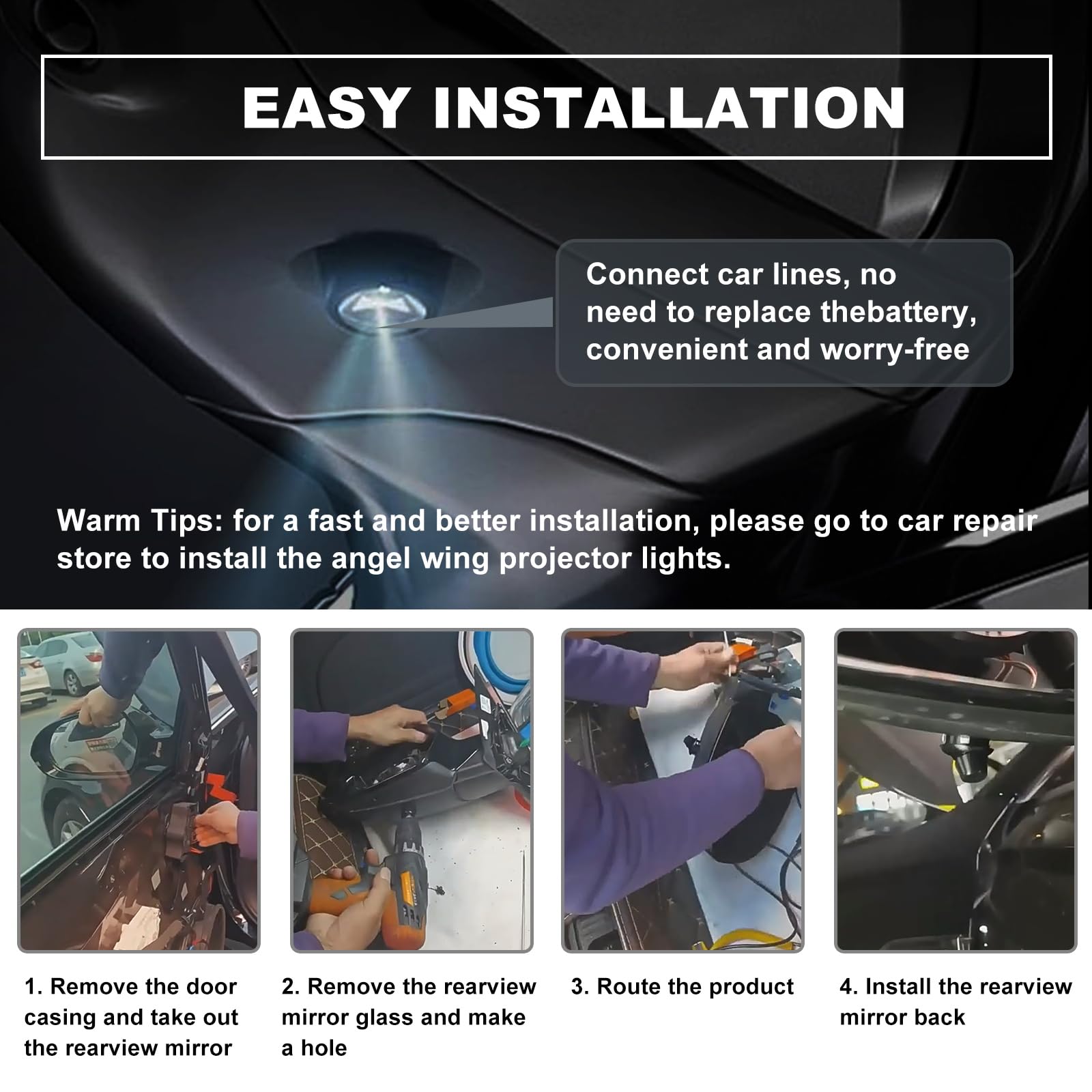 Instalación: Para instalar estas luces de bienvenida del espejo retrovisor del automóvil, puede perforar un orificio directamente desde el espejo retrovisor y pasar el cable a través del panel de la puerta usted mismo (asegúrese de que su espejo retrovisor se pueda perforar), o ir a un taller de reparación de automóviles para instalar la luz del proyector del espejo retrovisor del automóvil.